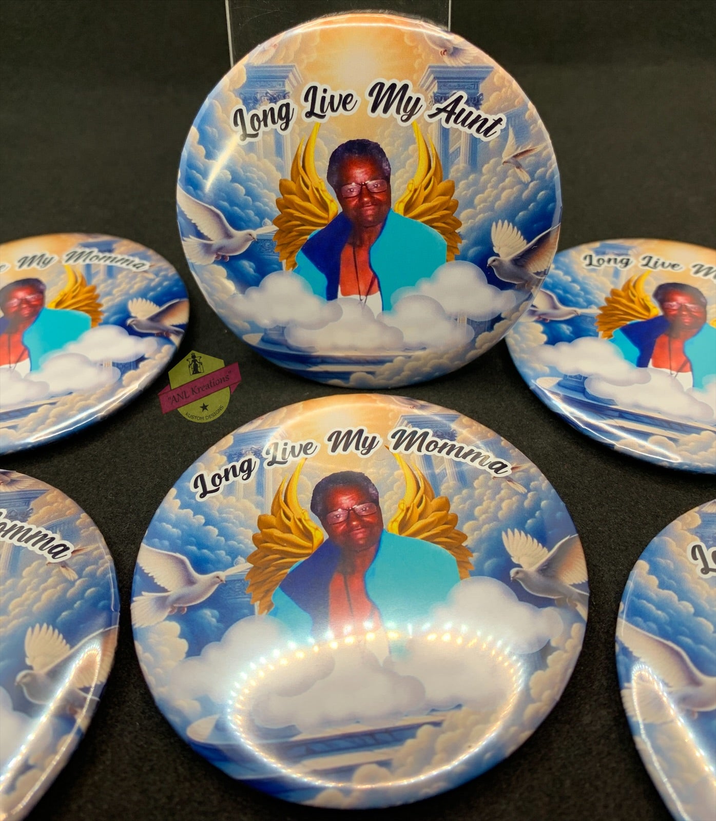 Custom Pins or Buttons for any occasion. These buttons can be customized for any occasion. They can be used for Birthdays, Holidays, Funerals, Memorial Services, Business purposes and much more. You can add pictures, text or both. These buttons come in two sizes. 2-1/4 inches round and 3 inches . Please email me the photo and or text as you would like it to appear on your button along with your order number to anlkreations@yahoo.com. Please allow 1 to 2 weeks processing time for all button/pin orders.
